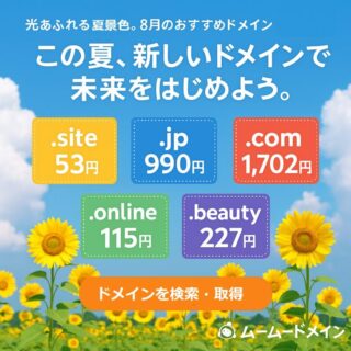 ムームードメインが2025年8月のおすすめドメインを特別価格でご紹介。.siteや.jp、.comなど人気ドメインをお得に取得できるこの夏、あなたのウェブプロジェクトを始めるチャンスです!